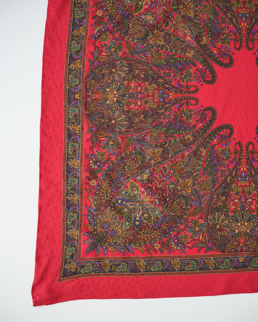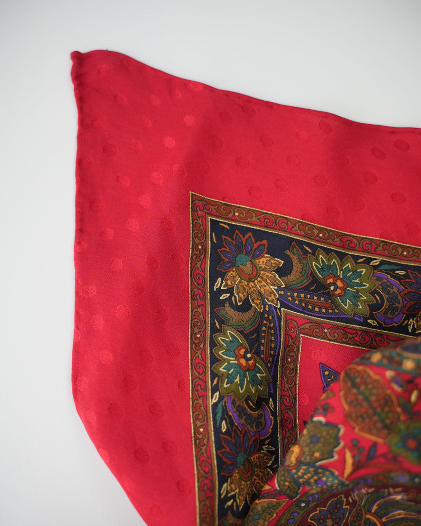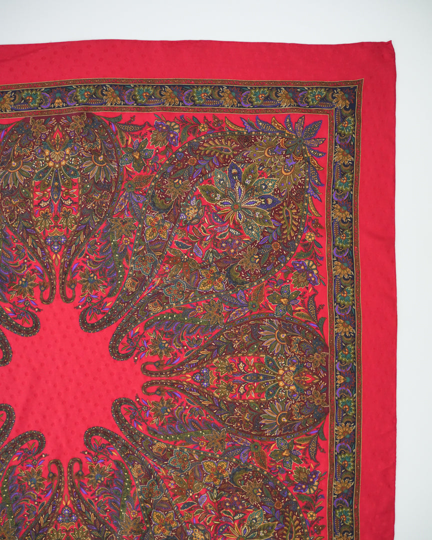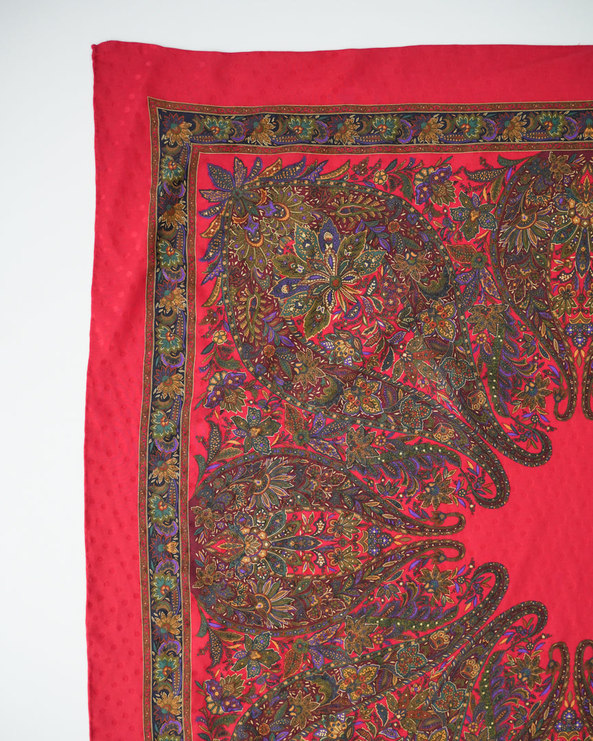 COMMENTS_深みのあるレッドを基調に、繊細で複雑なペイズリーパターンが放射状に広がるヴィンテージスカーフ。