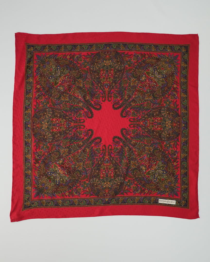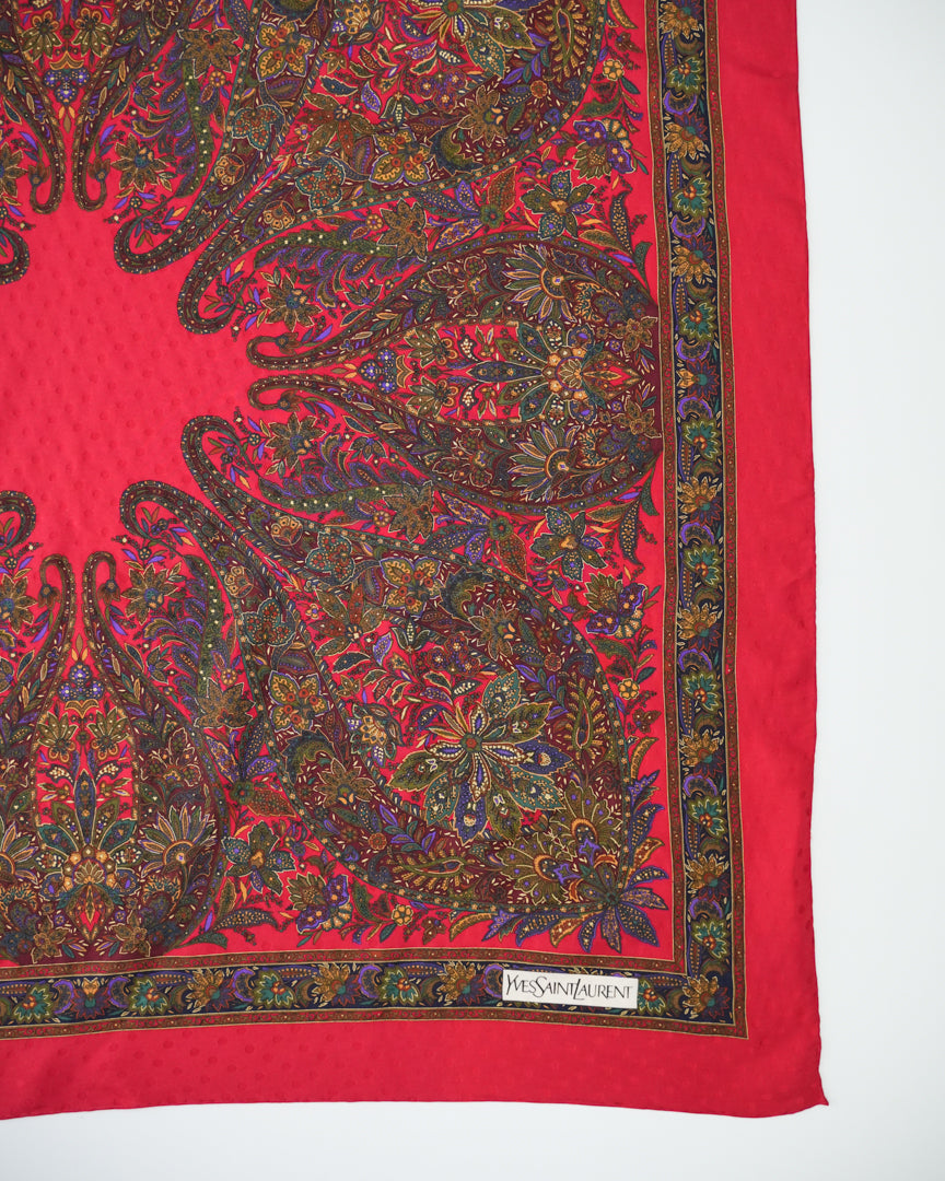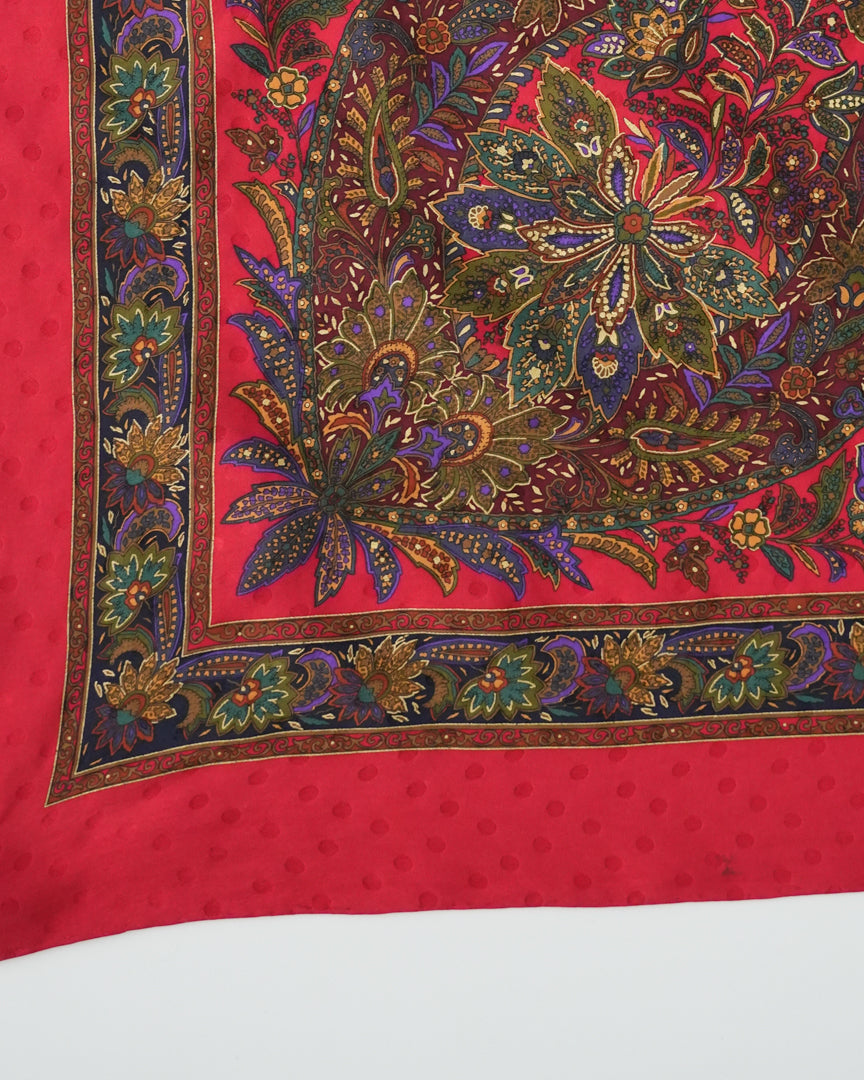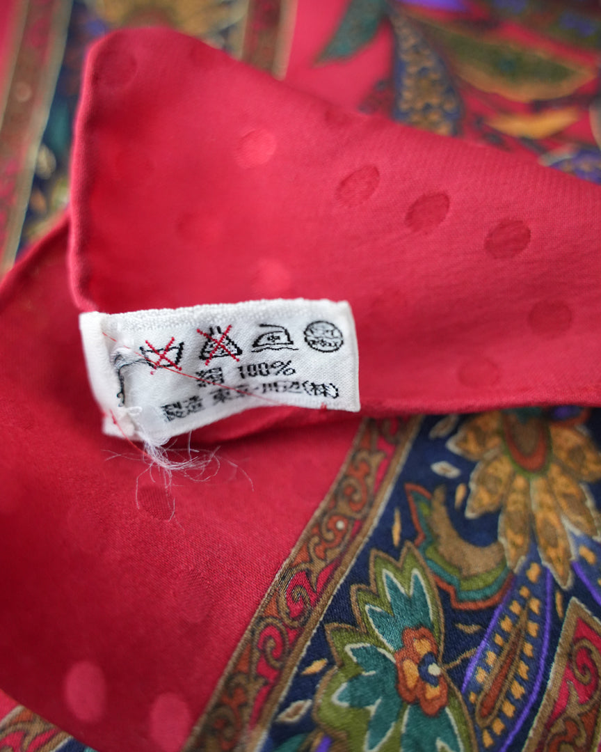 COMMENTS_深みのあるレッドを基調に、繊細で複雑なペイズリーパターンが放射状に広がるヴィンテージスカーフ。